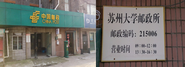 苏州大学本部校园设有邮政所,可以提供收发普通信件和EMS快递服务。地点在研究生院(蕴秀楼)背面,本部大礼堂对面。请注意营业时间。留学生平时可至怡远楼101室领取国际及国内信件。