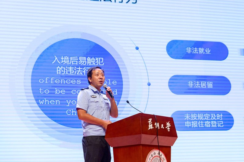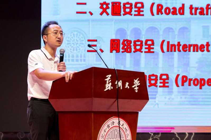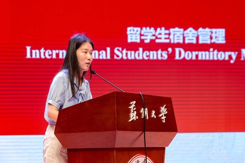 国际合作交流处副处长朱履骅介绍了苏州大学国际学生教育情况和国际学生管理制度。保卫部(处)光健老师、后勤管理处鲁喆老师、姑苏公安分局出入境管理大队王诣之警官和国际合作交流处顾昊昱老师分别就校园安全、宿舍管理、中国涉外法律法规以及学生签证、奖学金工作等做了详细解读。