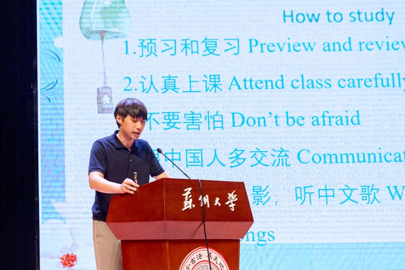 来自文学院的韩国籍学生金泰勋和能源学院的巴基斯坦籍学生萨拉分别作为本科生和研究生代表发言。他们结合自身经历,就学习方法、文化适应、课外活动等方面分享了经验,并向新同学们送出美好祝愿。