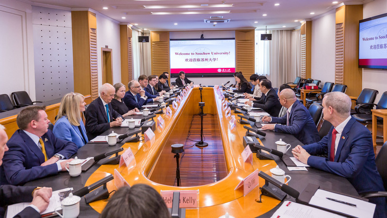 张晓宏对欧博仁大使一行的来访表示热烈欢迎。他表示,苏州大学和爱尔兰皇家外科医学院合作建立的国际创新药学院是我校首个中外合作办学机构,在两校的共同努力和中爱两国政府的大力支持下,该学院的各项工作稳步开展并取得显著成果。未来,我校将继续从政策保障、资源统筹与机制创新三方面全力支持创新药学院建设,依托苏州生物医药产业地标优势,推动学院的全面发展。同时,我们也期待与爱尔兰高校和科研院所进一步拓展交流与合作,共同推动中爱高等教育合作迈向更高水平。