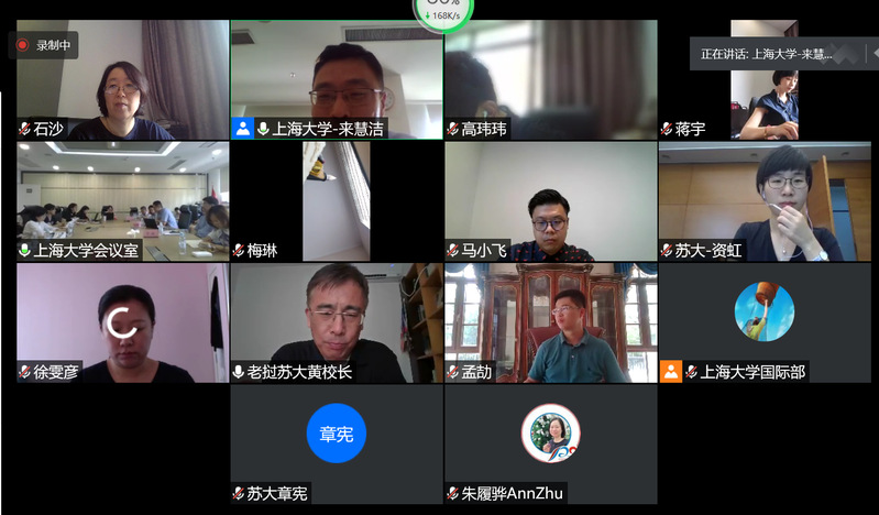 7月23日下午,上海大学与苏州大学就“未来5-10年国际化与开放办学发展思路与建设计划”主题开展了网络视频调研会。参与调研的有上海大学国际部党委书记吴英俊,上海大学国际部副部长、国际教育学院院长姚喜明,上海大学国际部副部长,国际合作处处长崔巍,上海大学国际合作处副处长来慧洁,上海大学国际教育学院副院长、国际合作处副处长阚怀未,上海大学国际合作处副处长、港澳台办副主任刘义,老挝苏州大学副校长黄兴,苏州大学人力资源处副处长章宪,苏州大学国际合作交流处副处长资虹,苏州大学国际合作交流处副处长朱履骅,苏州大学港澳台办公室副主任高玮玮等领导和两校国际化工作相关科室的负责人。会议由来慧洁和资虹共同主持。