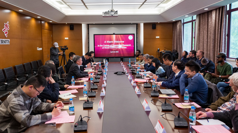 4月25日下午,以斯里兰卡共产党总书记维拉辛哈·吉格纳格(Weerasinghe Geeganage)为团长的世界共产党理论干部考察团一行访问我校,并与我校马克思主义学院开展座谈交流。中联部研究室主任金鑫、副处长、二级调研员吴航,江苏省外事办公室、苏州市外事办公室相关负责人,我校马克思主义学院院长田芝健、特聘教授方世南等出席了交流活动,交流会由港澳台办公室副主任,国际合作交流处、港澳台办公室党支部书记高玮玮主持。