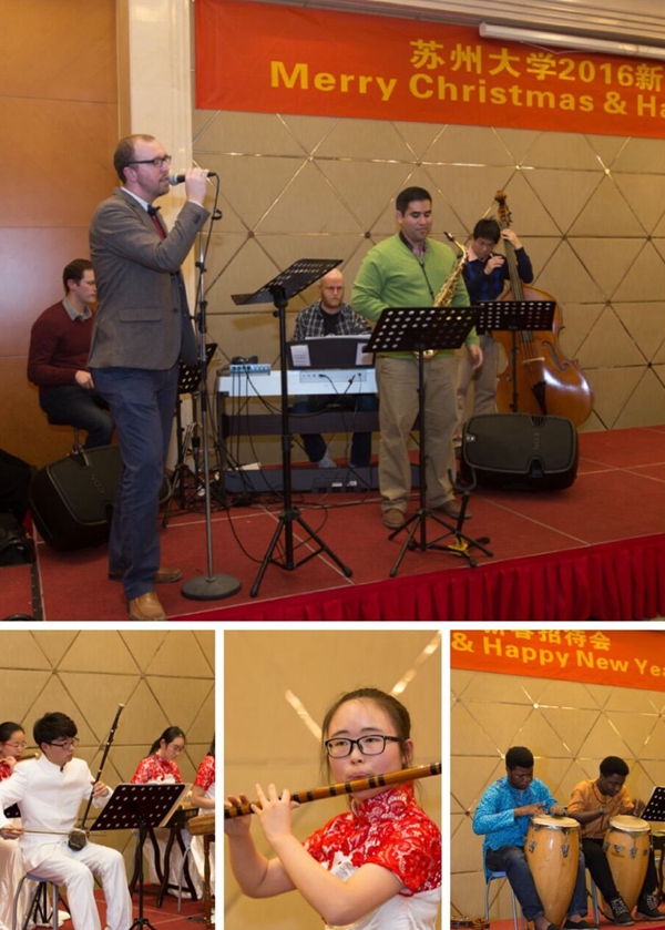 随后,音乐学院的外籍教师爵士乐队表演了经典的圣诞歌曲,校东吴艺术团的同学们献上精彩的竹笛和二胡独奏,而来自尼日利亚拉各斯大学同学的非洲鼓乐表演则将晚会掀了一个小小的高潮。在一曲曲美妙的音乐声中,来自不同国家和地区的外籍专家和教师们济济一堂,畅谈在苏州的生活和工作,共同度过了一个欢乐而美好的圣诞之夜。