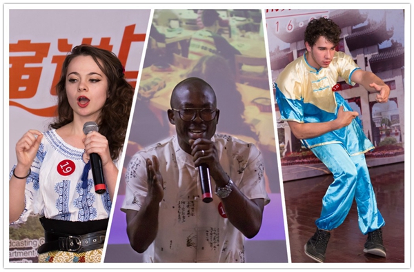 我校三位选手身着富有特色的民族服饰,满怀着对中国和汉语的热爱之情登上舞台。尼日利亚帅小伙于富,凭借其精准的汉语发音、超强的舞台感染力轻松摘得冠军,直接晋级总决赛。其他两位选手也有不俗的表现,史鼎羿一套五行拳和醉拳赢得现场观众的欢呼和惊叹,荣获亚军;爱丽丝演讲自然、内容感人,获得优胜奖。