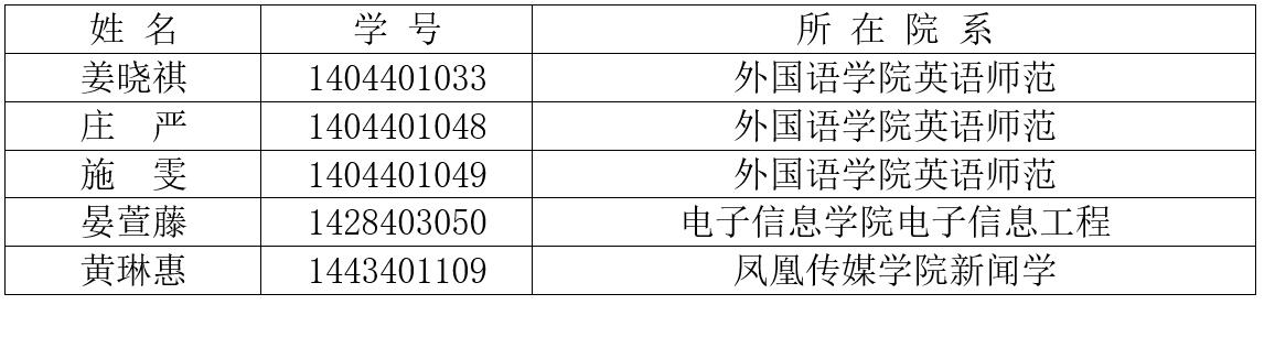 经本人申请、学院(部)推荐,学校审核通过,我校拟推荐姜晓祺等5名学生(名单请见附件)参加国家留学基金委《2017年加拿大Mitacs本科生实习项目》的申请。