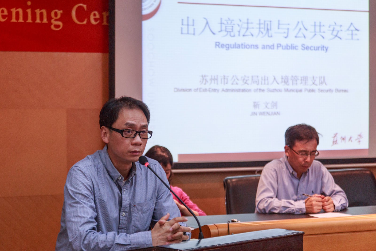 海外教育学院院长黄兴首先致欢迎辞,向奖学金新生介绍苏州城市概况及苏州大学基本情况,诚挚欢迎本学期入学的奖学金新生成为苏州大学和海外教育学院的一员,并鼓励留学生们努力学习汉语的同时,体验中国文化、了解中国国情,成为真正的中国通,架起中国与世界友谊的桥梁。随后,苏州市公安局出入境管理支队靳文剑警官发表题为“出入境法规与公共安全”的讲话,就留学生在华期间有关出入境、兼职就业、公共安全、国内旅游等方面的问题提供法律解读及安全教育,从警务工作者的角度为留学生在华生活给出意见和提示。