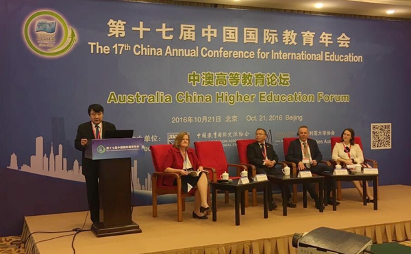 10月21日,由中国教育国际交流协会和澳大利亚大学协会联合主办的第十七届中国国际教育年会中澳高等教育论坛在北京国际会议中心举行。来自北京大学、清华大学、中国人民大学、厦门大学、同济大学、苏州大学等40余所中国大学和莫纳什大学、墨尔本大学、西澳大利亚大学等十余所澳大利亚大学的校领导及相关职能部门负责人参加了此次论坛。澳大利亚驻华大使Jan Adams、中国教育部国际合作与交流司副司长方军在开幕式上先后致辞。我校党委书记王卓君出席了本次论坛,并在学生流动专题上作了题为《学生国际流动的趋势与苏州大学的实践》的专题发言。