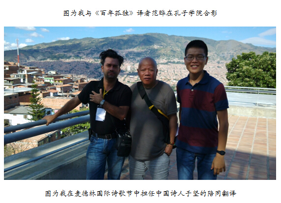 孔子学院中方院长高正月便是前中国驻哥伦比亚全权特命大使,他为人谦和,且人生经历丰富,在他身上我学到了好多东西。《百年孤独》的译者范晔教授来访麦德林,由孔子学院负责接待,我也得以一窥其真容。最让我印象深刻的是麦德林国际诗歌节,中国来了三名诗人,于坚、舒婷、骆英,由三个孔院的工作人员担任其陪同翻译。我有幸被安排给于坚作翻译,协助其接受当地媒体采访,并带其浏览麦德林风光。于坚的率性真诚,博学多才给了我很多启示。这次为期三天的密集翻译实践,让我的口译能力得到了不少提高。临行前,于坚还送了我一本签名诗集,这是此次活动最好的纪念吧。