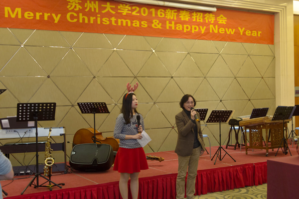招待会在欢乐喜庆的江南民乐声中拉开了帷幕。蒋星红副校长代表全校师生向为苏州大学的发展付出智慧和辛劳的全体外籍专家、教师及其家属致以节日的问候。她表示,在即将过去的一年中,我校在学科建设、人才培养、科学研究等各方面取得了令人瞩目的成绩,这些成绩的取得与我校全体外籍专家、教师的辛勤付出密不可分。蒋校长感谢全体外籍专家、教师不远万里来到苏州,成为苏州大学大家庭中的一员,与全体苏大人一起,为实现“国内一流,国际知名高水平大学”的目标而努力工作。蒋校长与出席招待会的外籍专家、教师共同祝愿苏州大学拥有更美好的明天。