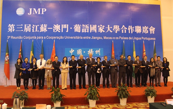 10月25日,第三届江苏-澳门·葡语国家大学合作联席会在扬州召开。省教育厅副厅长王成斌,省外事办公室副主任张松平,澳门特别行政区高等教育辅助办公室副主任曾冠雄,江苏-澳门·葡语国家友城联盟秘书长维多·拉马略,以及来自葡萄牙、巴西、莫桑比克、澳门特别行政区、江苏-澳门·葡语国家友城联盟的代表和省内20所高校的校长或代表出席会议。我校副校长蒋星红代表学校出席并主持了三方高校协议签署仪式。