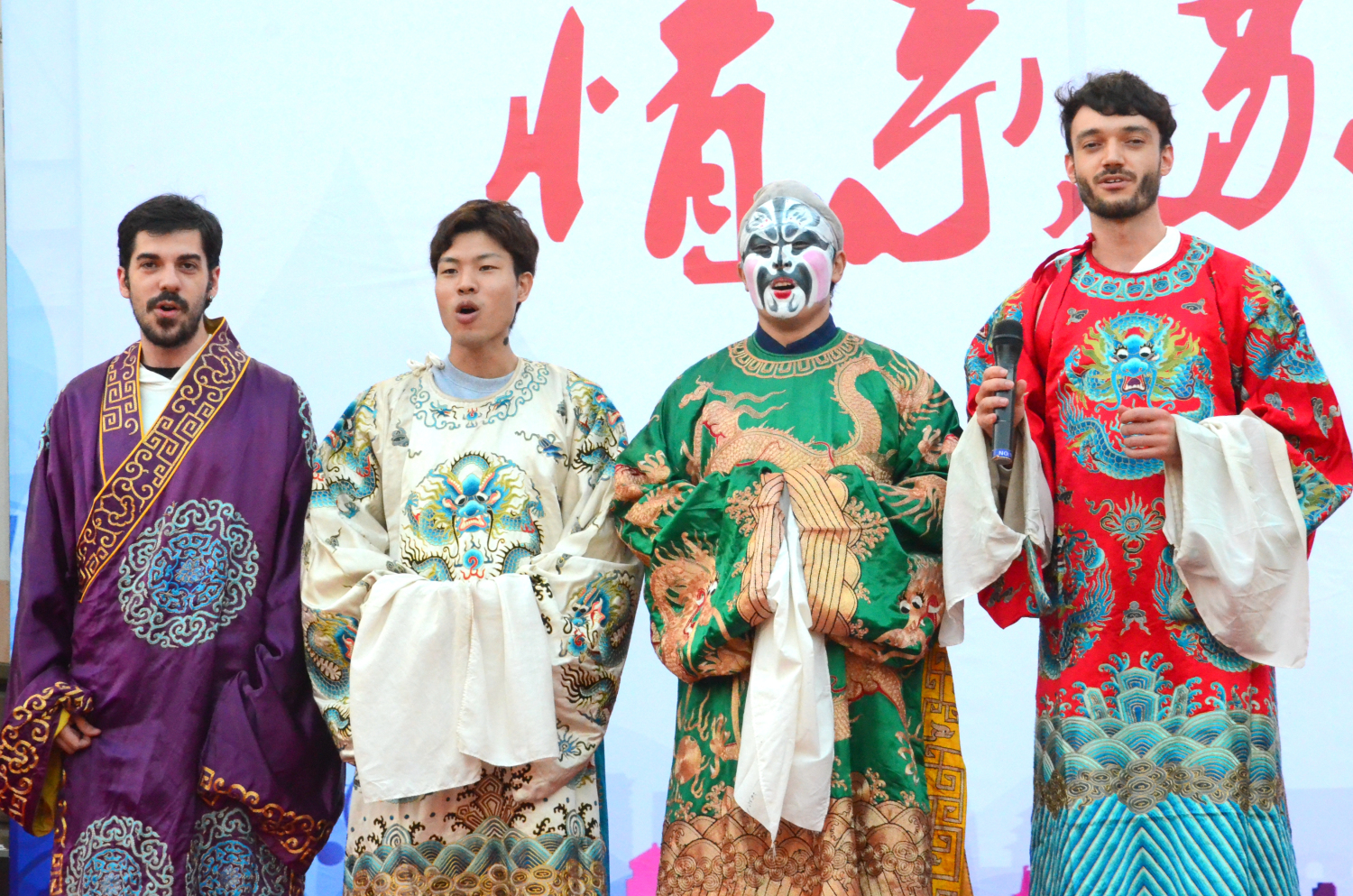 数延隼是一名日本留学生,刚来苏大8个月,穿上戏服、画好张飞的脸谱,摆了一个帅气的姿势。“画脸谱的过程非常有趣,就是高音部分太难唱了”,他笑着说。
