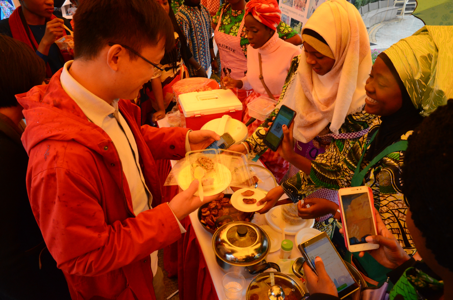 此外,日本章鱼小丸子、韩国辣炒年糕、印度咖喱角、西班牙土豆饼、尼日利亚炒饭和炸香蕉依然是今年大热的人气产品。同学们或在展位前排队购买,或站在路旁品尝,有说有笑,十分热闹。