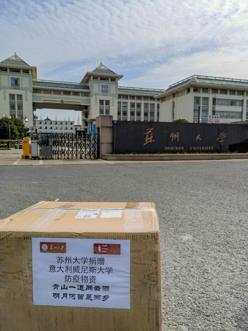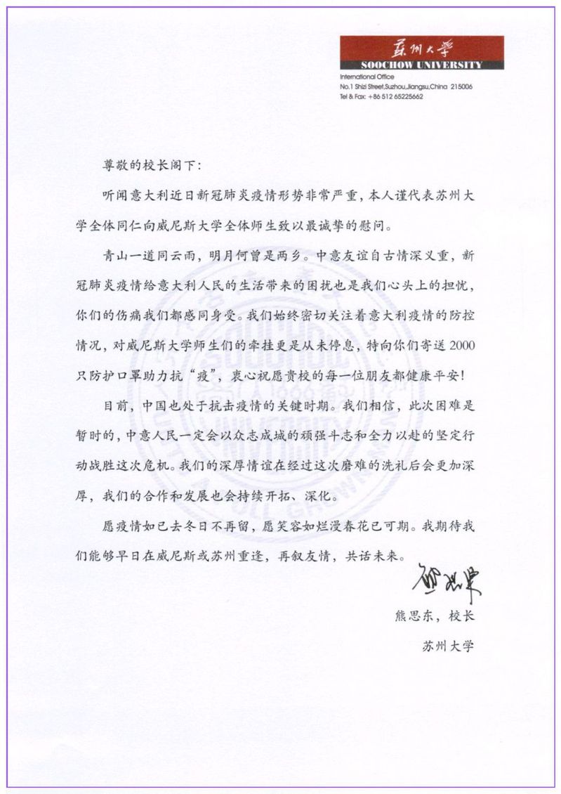 苏州大学与威尼斯大学在2017年建立了战略合作伙伴关系。在意大利的疫情爆发以后,我校党委常委、副校长张晓宏在第一时间向威尼斯大学副校长Tiziana Lippiello发信慰问。在得知威尼斯大学防疫形势严峻,尤其物资紧缺的情况后,我校党委书记江涌和校长熊思东都万分挂念。熊校长代表我校全体师生向威尼斯大学校长Michele Bugliesi发去诚挚慰问,并表示急难有情,情有馀兮,苏州大学将提供支持,唯盼师生朋友安康无恙。