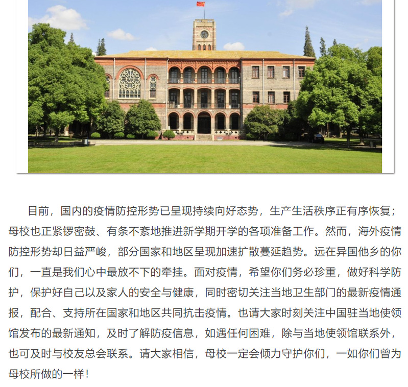 同时,学校高度重视海外校友的疫情防控工作,校友总会与各海外校友分会时刻保持密切联系,及时和海外校友们分享最新的防疫信息和最有效的防疫经验,并广泛联络、大力动员国内各校友组织,积极协调各方力量以帮助海外校友们共抗疫情,共渡难关。