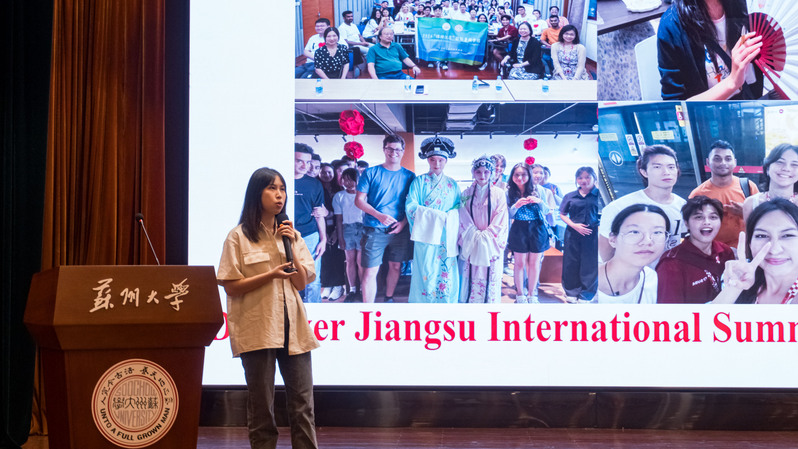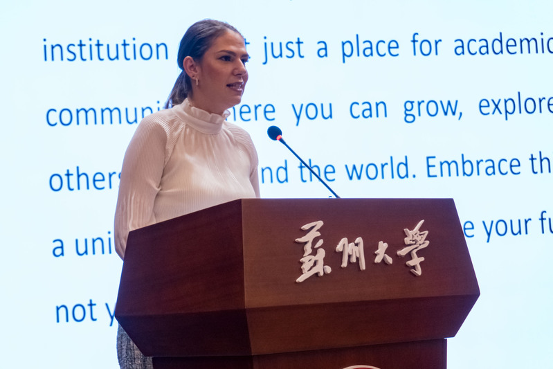 “留学苏大”协会宣传部部长,来自印度尼西亚的洪乙绮向在座国际新生们介绍了协会的发展历史、组织架构,以及近年来举办的特色活动。她表示,中外融合是“留学苏大”协会最大的特色,希望有更多的国际新生加入协会,和中国学生一起推动中外文化交流。