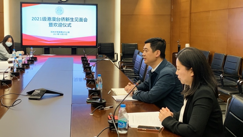 高玮玮首先代表苏州大学港澳台办公室,欢迎各位2021级港澳台侨本科生及来自港澳台友好学校的秋季学期交换生来到苏州大学。他介绍了学校港澳台侨学生在招收、培养、管理等方面的政策以及奖助学金条例、国情教育学习方案等。他勉励同学们刻苦学习,积极参与各类校园文化活动,在未来拥有一段愉快而充实的大学生活。