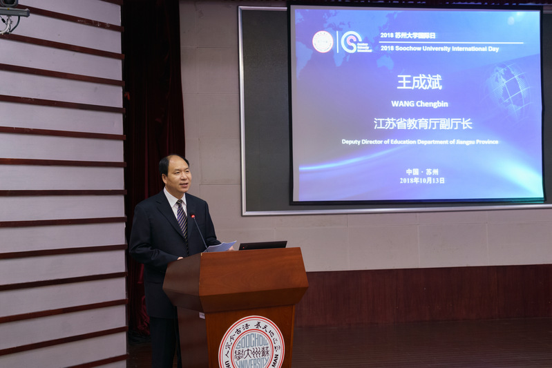王成斌副厅长致开幕辞。他指出,全球化、国际化已成为当今世界教育发展的重要趋势和鲜明特点,教育能够培养出更多具有国际视野、通晓国际规则、具有创新精神和实际能力的各类人才。对于未来江苏教育的对外开放发展,他指出,要紧紧围绕国家外交大局和江苏的对外开放而展开,要以发展具有中国特色、国际水平的江苏教育而展开,要紧紧围绕培养国际视野和国际竞争力的人才而展开。王成斌副厅长充分肯定了近年来我校国际化工作取得的发展成绩,并希望学校今后能进一步彰显学校的国际化特色,为学校“双一流”大学的建设,为提高学校办学质量,为服务国家和区域经济社会发展需要作出应有的贡献。