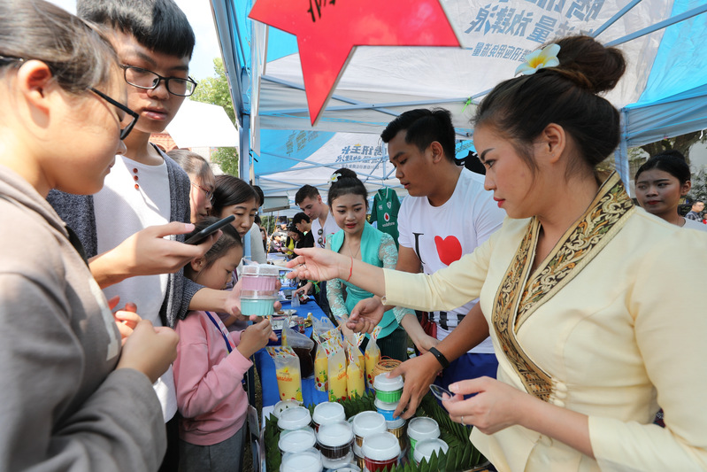 不仅海外教育展受欢迎,活动现场,美食展台也挤满了师生。来自22个国家的中外学生献上了丰富多彩的风情展、美食展和才艺秀。尼日利亚的五色饭、爱尔兰的奶酪、韩国拌饭、印度尼西亚的黄金糕等百余种美食让人眼花缭乱,垂涎不已。来自越南的阮氏芰同学一大早就和同伴们忙碌起来,准备食材和调料,他们准备的越南炸春卷和生春卷深受大家喜爱,很快就被抢购一空。“虽然很忙,大家都很高兴,能够和这么多国家的学生一起交流文化,感觉很自豪和温暖。” 阮氏芰同学笑着说。