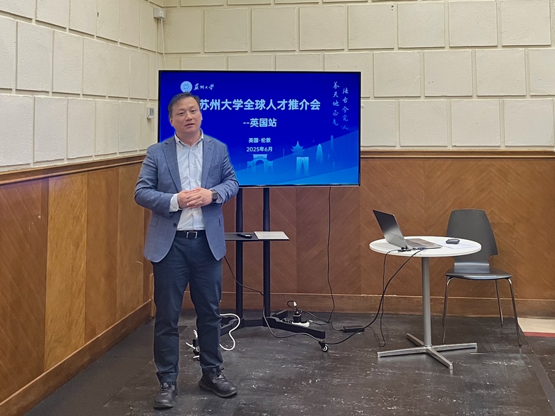 6月6日,苏州大学全球人才推介会英国站在剑桥举办。张正彪出席活动并诚挚邀请海外优秀人才加盟苏大,携手共谋发展新篇。何峰详细介绍了学校的基本校况、学科建设发展、人才支持政策以及人才引进需求。会议期间,多位在苏大工作的青年专家结合自身海外求学经历,分享了选择加盟苏大的考量与成长路径。