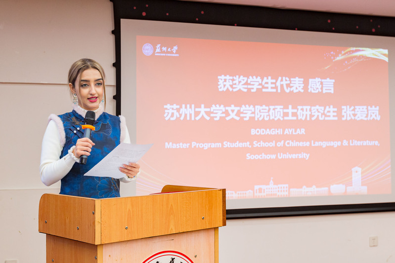 来自伊朗的文学院硕士生张爱岚代表优秀国际学生发言。她感谢了学校和老师的悉心指导和辛勤付出,让她实现了留学中国的学术梦想,拓展了国际化视野。她希望未来能成为一名国际中文教育教师,通过语言和文化的传播,为构建更加和谐美好的世界贡献力量。