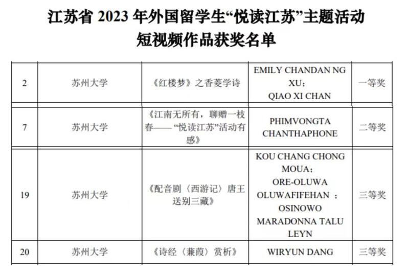 此次活动由江苏省教育厅主办,江苏省高等教育学会外国留学生教育管理研究委员会协办,苏州大学与南京师范大学、扬州大学、扬州工业职业技术学院和江苏师范大学等5所学校共同承办。“悦读江苏”主题活动自今年5月起,历时7个月,依次完成“悦读金陵”、“悦读彭城”、“悦读广陵”和“悦读姑苏”等“行走江苏”系列活动,并组织省内高校留学生进行推荐书目的阅读和创意作品评比展示活动。苏州大学作为承办院校之一,在圆满完成“悦读姑苏”系列活动的同时,也积极组织外国留学生阅读书籍、结合书籍行走江苏,完成了多件创意作品。经专家评委们的认真评审,苏州大学获得优秀组织奖,同时参赛作品也分获短视频作品一、二、三等奖。