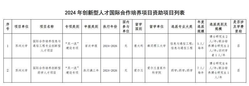 此次获批的两个项目分别为我校电子信息学院与意大利都灵理工大学合作举办的“国际合作培养信息与通信工程专业创新型人才项目”、药学院与爱尔兰皇家外科学院合作举办的“国际合作培养创新型药学项目”(执行期满更新)。项目依托我校相关专业和国外顶尖科研院所的优势资源,面向国家重大战略需求,旨在搭建具有引领示范作用的国际人才培养与合作交流平台。项目执行期为三年(2024-2026),选派类别包括攻读博士学位研究生、联合培养博士研究生和访问学者,国家留学基金委将资助项目人员往返国际旅费和资助期限内的奖学金。