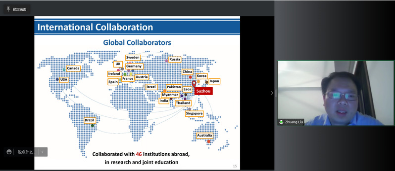 刘庄介绍了我校纳米科学技术学院的师资团队、人才培养、科研成果和国际合作等情况。近年来,学院主要聚焦光电学、新能源、生物医学、环境四大研究领域,学院多名教师在国际知名学术期刊任职并发表一系列高质量论文,国际学术影响力持续上升。