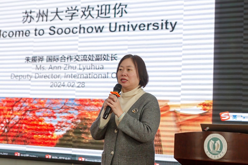 国际合作交流处副处长朱履骅首先对国际学生表示热烈欢迎,并介绍了苏州大学的发展现状和国际学生情况。她希望同学们能“学好汉语、读懂中国、搭建桥梁”,尽快适应中国校园生活,深入了解中国,把自己的中国故事介绍给身边更多的人。
