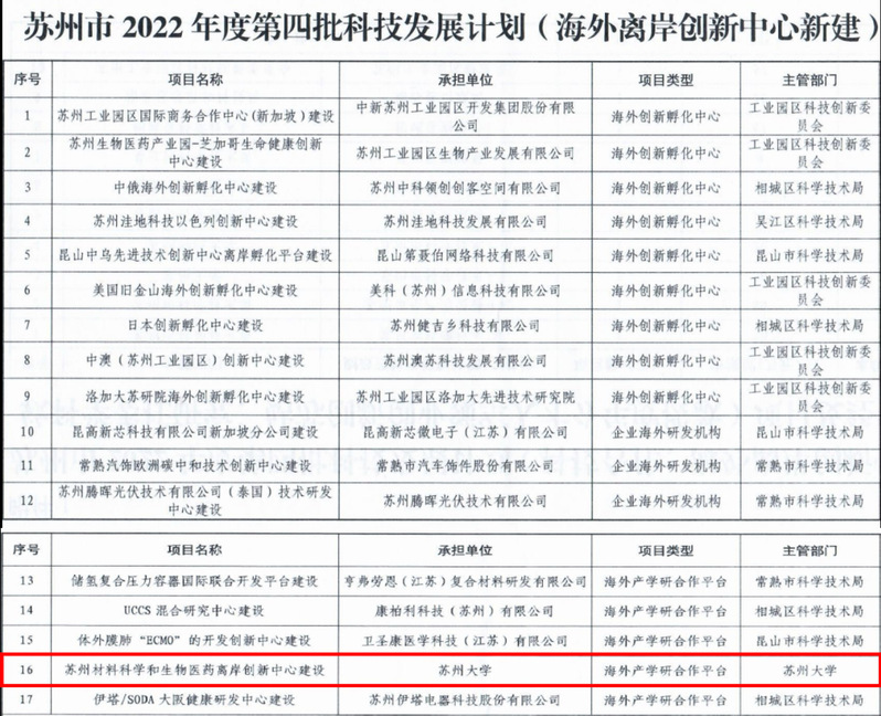 我校“苏州材料科学和生物医药离岸创新中心”入选苏州海外离岸创新中心新建项目