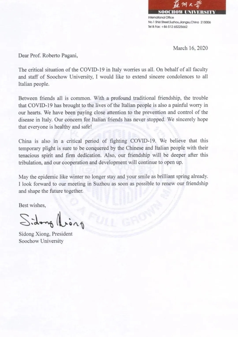 China-Italy friendship has a long history and deep roots. Upon the outbreak of the COVID-19 in China, the Italian Consulate General in Shanghai sent a letter of sympathy to President Sidong Xiong. After the outbreak of the epidemic in Italy, President Sidong Xiong also sent a letter of consolation to Professor Roberto Pagani, Science and Technology Counsellor of the Consulate General of Italy in Shanghai. In the letter, President Xiong has expressed that all faculty and students of Soochow University are deeply concerned about the Italian people and hope that Italian friends could fight bravely and contain the outbreak at an early date.
