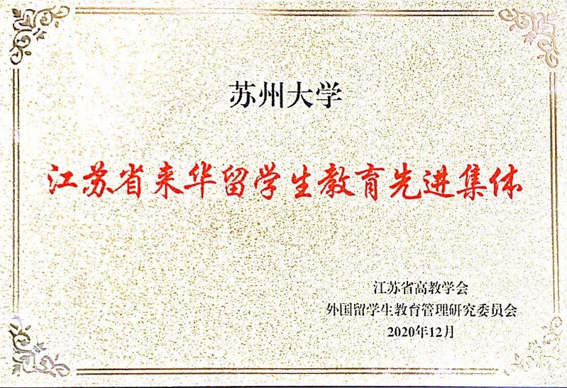 苏州大学荣获2020年度“江苏省来华留学生教育先进集体”