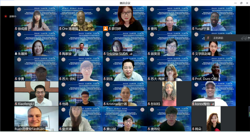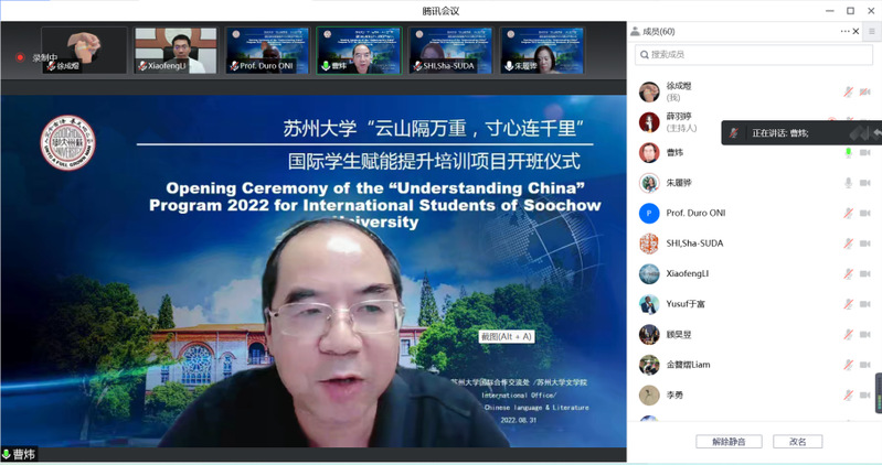 为进一步提升境外国际学生的汉语能力和专业素养,搭建与中国老师、同学沟通交流的平台,8月31日晚,苏州大学 “云山隔万重,寸心连千里”国际学生赋能提升培训项目开班仪式在线上顺利开班。苏州大学党委常委、副校长李孝峰教授,尼日利亚拉各斯大学校领导Duro Oni教授,文学院院长曹炜教授,国际合作交流处副处长朱履骅、资虹及相关科室老师石沙、梅琳、顾昊昱,文学院党委副书记阴浩、副院长赵曜、教授李勇、汉语国际教育中心主任陶家骏、留学生辅导员薛羽婷以及苏州大学国际学生代表、尼日利亚拉各斯大学“中国学”专业师生及校友等六十余人参加了会议。本次会议由朱履骅主持。