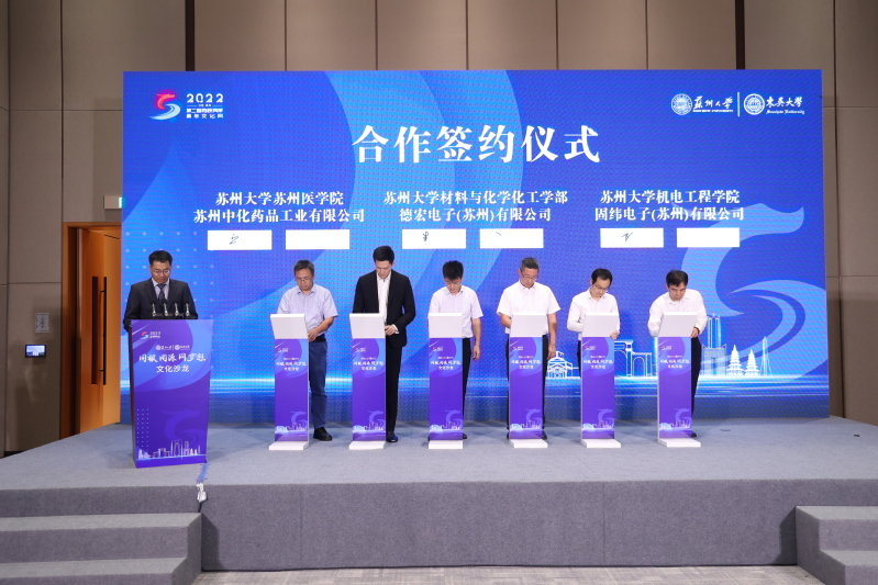 在活动现场,苏州大学苏州医学院与苏州中化药品工业有限公司,苏州大学材料化学化工学部与德宏电子(苏州)有限公司,苏州大学机电工程学院与固纬电子(苏州)有限公司签署了合作协议。