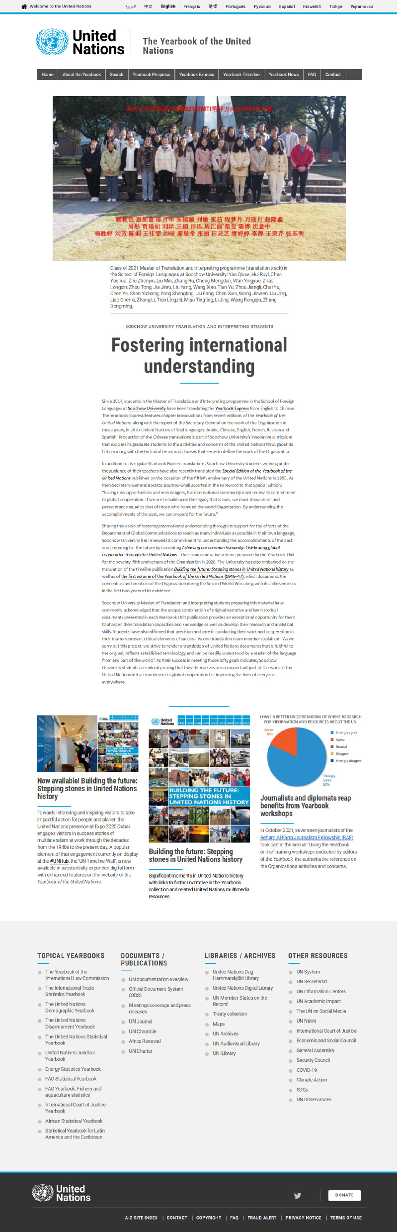 除了定期完成《年鉴快车》的翻译任务,我校学子还在专业教师的指导下翻译了1995年为纪念联合国成立五十周年而出版的《联合国年鉴特刊》。多名优秀学子前往美国纽约联合国总部进行实习,实习工作质量得到了联合国新闻司的高度评价。联合国实习生项目不仅展现了我校学子的风采,更反映出我校国际化办学的特色。