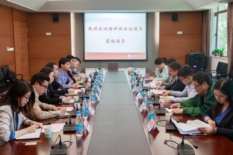 张晓宏首先代表学校对省外办领导一行的到来表示热烈欢迎。他同时指出,苏州大学高度重视国际化战略,近年来在省外办全体人员的支持下,我校国际交流合作工作顺利开展。国际学术会议、因公出访团组数量日益增多,这些均得益于省外办相关领导在外事政策、因公出国(境)审批等环节给予的大力支持。张桥处长向调研组汇报了苏州大学在国际合作与交流、服务“一带一路”人文交流以及因公临时出国(境)管理等方面的情况。他具体介绍了苏州大学在坚持党管外事、落实科研人员放管服、信息公开与宣传培训方面的做法,同时也对目前因公出国(境)工作中所遇到的问题提出了建议。