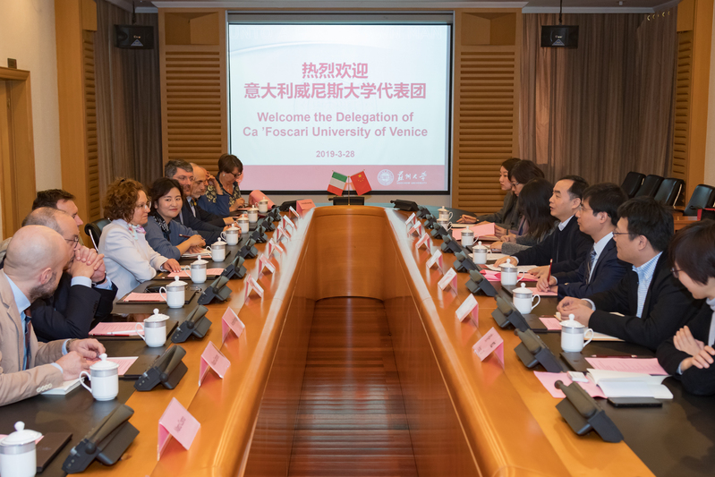张晓宏对威尼斯大学代表团一行表示欢迎,并向客人介绍了苏州市特别是苏州大学的基本情况。他表示,长期以来苏州大学坚持开放办学,积极开展国际交流与合作,与欧洲多所大学建立起友好合作关系。意大利是中国在欧盟内值得信赖的好朋友和重要合作伙伴,自2017年2月正式建立合作关系以来,苏州大学和威尼斯大学先后四次进行交流互访,携手开展了包括“双城三桥”合作科研项目、Eramus+项目以及海外双向实习项目等一系列合作。习近平主席近期成功访问意大利,中意两国战略合作发展迅速,为两校的国际交流合作创造了良好条件,我校期待以此为契机进一步推动和促进两校在学生交换、教师交流和科研等方面的深入合作,深化人文交流,为“一带一路”倡议贡献历史文化方面的研究成果。