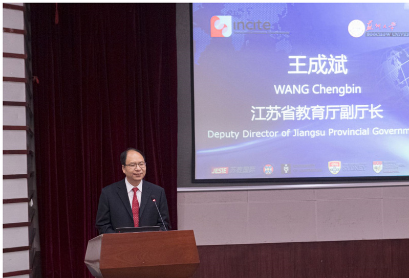 王成斌对来自五个国家的一百多名师生表示了热烈的欢迎。他表示,在活力的苏州和美丽的苏州大学校园内生活、学习的这段时间,一定会成为同学们铭记一生的珍贵时刻。他指出,江苏高等教育国际化已经进入新的阶段,江苏高校正在努力推进与世界一流大学交流合作。奋进中的江苏高等教育也吸引着世界的目光,每年与世界百强大学有数万人次双向人才交流。越来越多的国际大学生表达到中国、来江苏学习交流的积极愿望。中国学生要走出去,也欢迎外国学生来苏学习。今天,由苏州大学、苏教国际联合英国爱丁堡大学、澳大利亚悉尼大学、荷兰阿姆斯特丹大学、新加坡南洋理工大学等世界知名大学,立足国际学生发展需求,共同开发的“英才短期学习交流项目”是一个很好的起点。他相信,此次项目将在互联网、云计算、大数据和人工智能技术革命大背景下,培养学生创新创业的企业家精神和跨文化竞争力,培养符合时代发展需求的具有国际视野的创新创业型未来企业家。