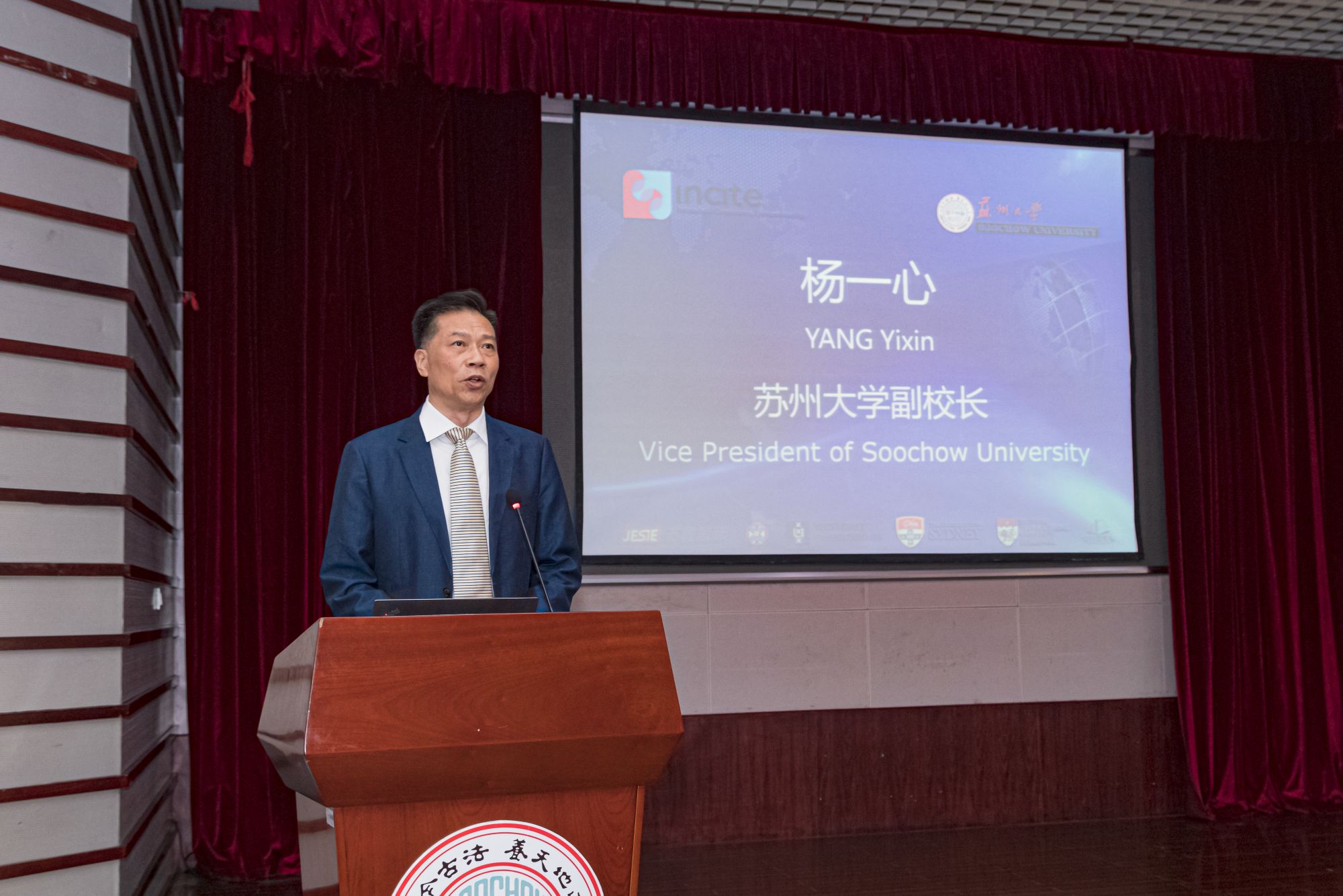 杨一心在欢迎辞中表示,英才项目是由苏州大学和苏教国际共同承办,由英国爱丁堡大学、澳大利亚悉尼大学、荷兰阿姆斯特丹大学以及新加坡南洋理工大学等四所世界知名高校以及南京师范大学、南京财经大学、南京审计大学、江苏大学、苏州大学等5所江苏省内著名高校的130余名中外学生共同参与,在接下来的两周时间内,将围绕“跨文化能力和企业家精神”开展学习、交流和竞赛活动。他代表苏州大学向各位的到来表示热烈的欢迎和衷心的感谢。杨校长指出,英才项目选择在苏州大学举办,是因为苏州大学重视开放、创新和包容,这既是学校也是苏州这所城市能够保持活力的原因,与英才项目“跨文化能力和企业家精神”的主题完全契合,他期待所有参加英才项目的年轻朋友们,能够在苏大这个美丽的校园,在苏州这座历史文化名城,在短短的两个星期里,以开放的姿态充分表达自己的思想和见解;以包容的心态接纳多元的主张和观点;以创新的状态去生成我们对文化与企业理解的新观念。