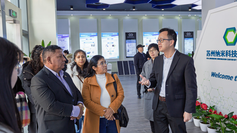 会谈后,代表团一行参观了苏州大学纳米科技协同创新中心。李彦光教授详细介绍了中心在纳米材料、生物医学等领域的科研成果,并强调其作为国家级平台的跨学科协同优势。秘鲁议员一行对中心的创新机制和产学研转化成果表示出浓厚兴趣,双方还就材料科学领域的合作潜力展开了探讨。